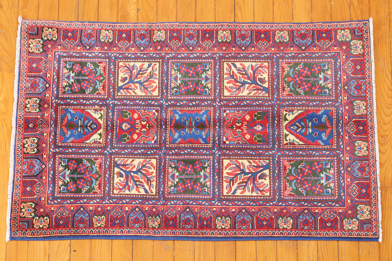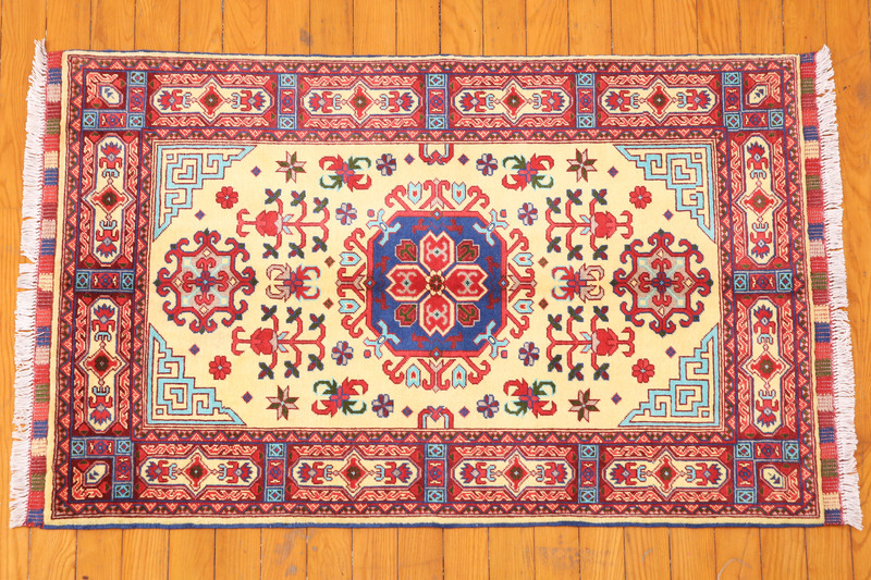 Khan Mamdi rugs stand out for their bold geometric and stylistically floral designs in rusts, reds, blues and greens.
