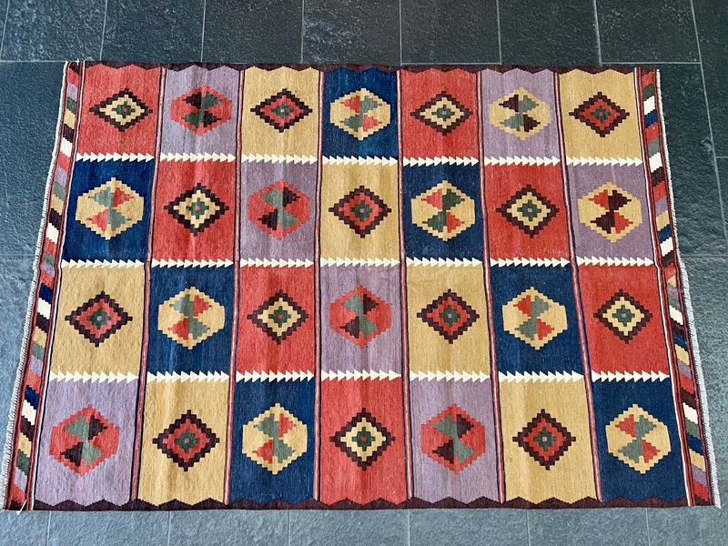 Kilims are flat weave carpets and therefore do not have a pile like the rest of our collection. Crafted primarily on vertical looms, these rugs are woven using a warp-wrapping method. Known as sumeck kilims, the rugs are virtually reversible but there is a decided right side to these kilims. Their wool is naturally dyed using both hand-gathered natural dyes and more commercially farmed natural dyes like cochineal and indigo. They also spotlight the natural wool colors coming directly from the dhumba sheep.