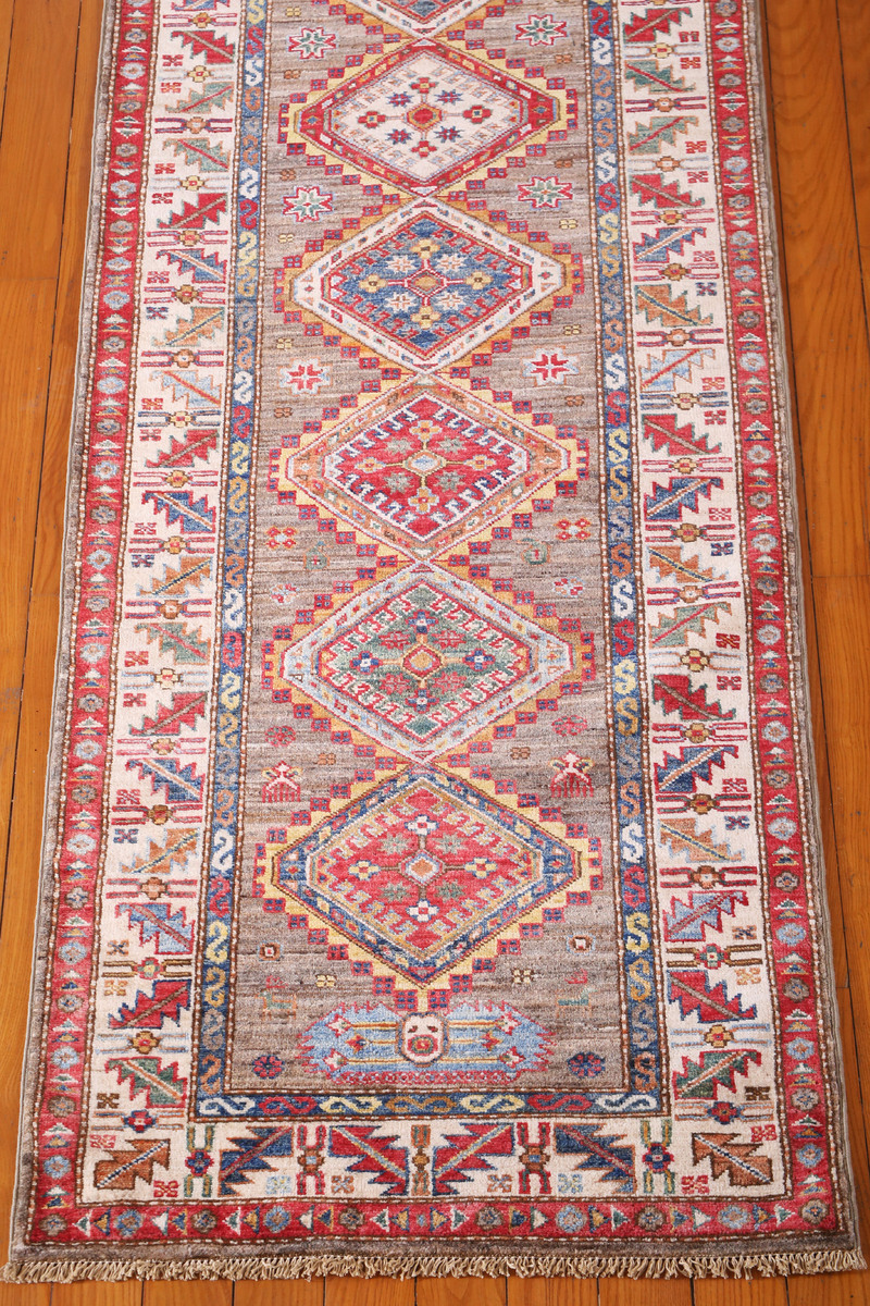 Chobi rugs are traditionally produced in many regions of Pakistan. The word "chobi" is from the Farsi word "chob" which means wood, referring to the source of its natural dyes. Our Chobis tend to have large geometric floral patterns. They are all hand-knotted with hand-spun wool spun primarily by a drop spindle. Their natural dyes are made entirely from hand-gathered fruits, vegetables, roots, tree barks and dried shells, making Chobis the most labor-intensive of all of our tribal carpets.