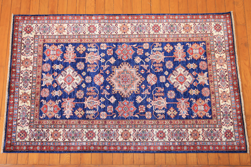 Kazaks are known for their indigo blues, reds and ivories, as well as their casual and warm appearance. Our Kazak rugs are almost entirely naturally-dyed, however, Kazak natural dyes are commercially farmed natural dyes (such as indigo and cochineal) and are therefore less labor intensive for our artisans than hand-gathered natural dyes. The reason for the phrase "almost entirely naturally-dyed" is because some artisans choose to augment their natural dyes with some commercially-available dyes in order to create the precise color they desire. The wool in Kazaks, like the wool found in Chobis and Gabbehs, is hand spun using a drop-spindle.