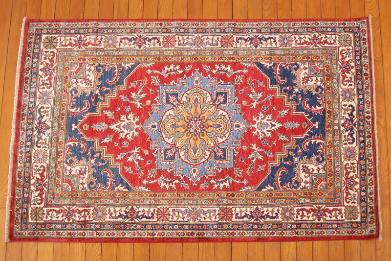 Kazaks are known for their indigo blues, reds and ivories, as well as their casual and warm appearance. Our Kazak rugs are almost entirely naturally-dyed, however, Kazak natural dyes are commercially farmed natural dyes (such as indigo and cochineal) and are therefore less labor intensive for our artisans than hand-gathered natural dyes. The reason for the phrase "almost entirely naturally-dyed" is because some artisans choose to augment their natural dyes with some commercially-available dyes in order to create the precise color they desire. The wool in Kazaks, like the wool found in Chobis and Gabbehs, is hand spun using a drop-spindle.