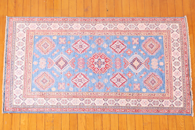 Kazaks are known for their indigo blues, reds and ivories, as well as their casual and warm appearance. Our Kazak rugs are almost entirely naturally-dyed, however, Kazak natural dyes are commercially farmed natural dyes (such as indigo and cochineal) and are therefore less labor intensive for our artisans than hand-gathered natural dyes. The reason for the phrase "almost entirely naturally-dyed" is because some artisans choose to augment their natural dyes with some commercially-available dyes in order to create the precise color they desire. The wool in Kazaks, like the wool found in Chobis and Gabbehs, is hand spun using a drop-spindle.