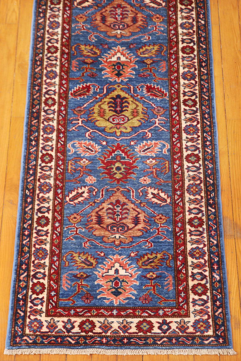Kazaks are known for their indigo blues, reds and ivories, as well as their casual and warm appearance. Our Kazak rugs are almost entirely naturally-dyed, however, Kazak natural dyes are commercially farmed natural dyes (such as indigo and cochineal) and are therefore less labor intensive for our artisans than hand-gathered natural dyes. The reason for the phrase "almost entirely naturally-dyed" is because some artisans choose to augment their natural dyes with some commercially-available dyes in order to create the precise color they desire. The wool in Kazaks, like the wool found in Chobis and Gabbehs, is hand spun using a drop-spindle.