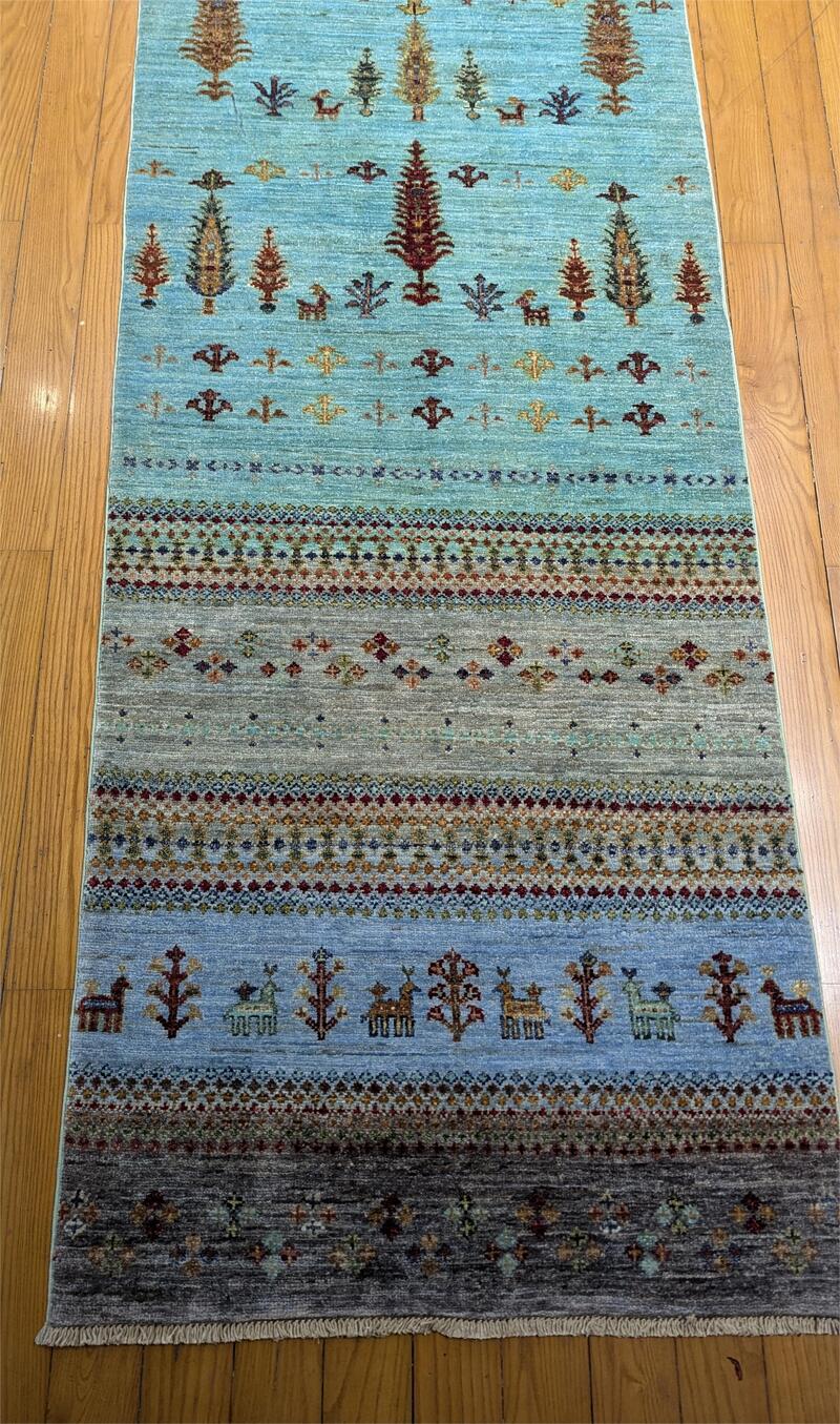 Chobi rugs are traditionally produced in many regions of Pakistan. The word "chobi" is from the Farsi word "chob" which means wood, referring to the source of its natural dyes. Our Chobis tend to have large geometric floral patterns. They are all hand-knotted with hand-spun wool spun primarily by a drop spindle. Their natural dyes are made entirely from hand-gathered fruits, vegetables, roots, tree barks and dried shells, making Chobis the most labor-intensive of all of our tribal carpets.